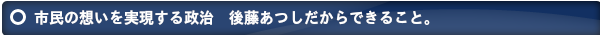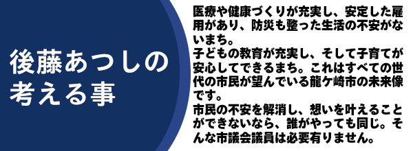 政務活動費ひとつをとっても、議会の常識は世間の非常識。市民目線の議会改革で、密室政治から市民に開かれた、議員の活動が見える市議会に変えます。しがらみのない、後藤あつしだから言えること、出来ることがあります。